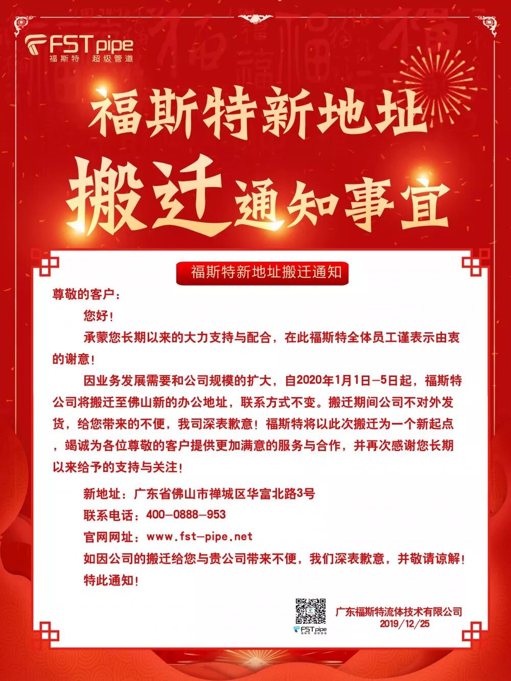 承蒙您长期以来大力支持与配合,在此福斯特全体员工谨表示由衷的谢意!因公司业务发展需要和公司规模的扩大,自2020年1月1日-5日,福斯特公司将搬迁至佛山新的办公地址,联系方式不变。搬迁期间公司不对外发货,给您带来的不便,我司深表歉意!福斯特将以此次搬迁为一个新起点,竭诚为各位尊敬的客户提供更加满意的服务与合作,并再次感谢您长期以来给予的支持与关注!